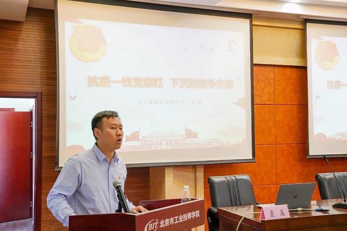 近日,荣获北京市优秀共产党员、抗击新冠肺炎疫情先进个人光荣称号的北化集团团委副书记聂晶,回到母校——北京市工业技师学院,以“抗疫一线党旗红,下沉防控争先锋”为主题,为学院70多名以在校学生干部为主的党团员、入党积极分子、青年上了一次生动的党课。