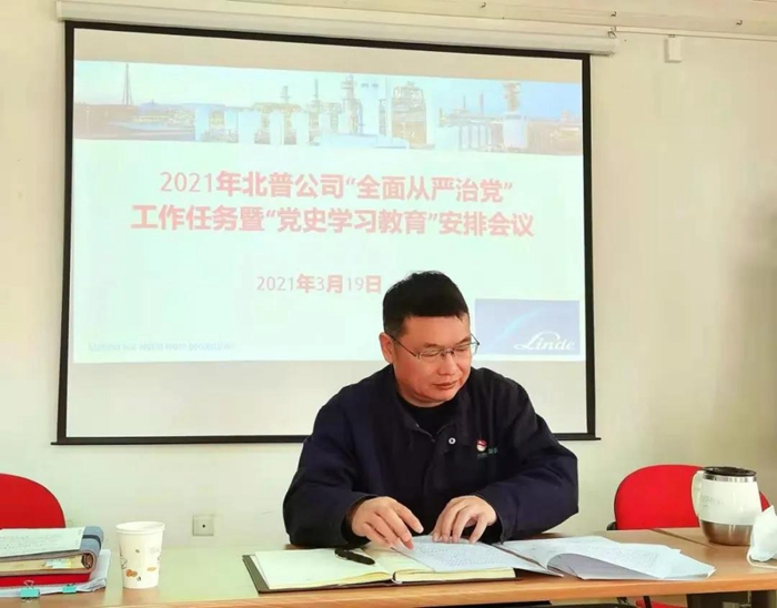 3月19日,北普公司党委召开党史学习教育动员部署大会,党委书记吴时林作动员讲话。党委领导班子成员、各基层党支部支委会全体成员参加会议。