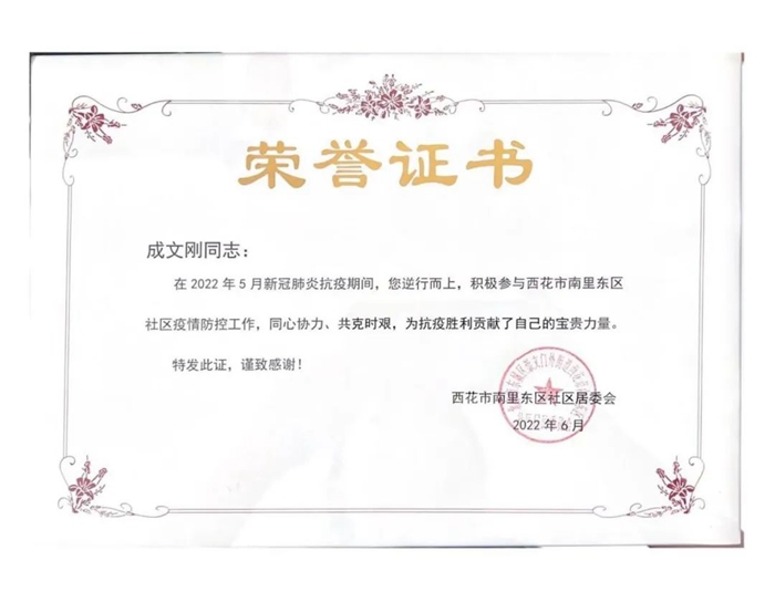 近日,东城区西花市南里东区社区居委会为化研院共产党员成文刚颁发了荣誉证书,以表彰他积极参加社区防控工作。