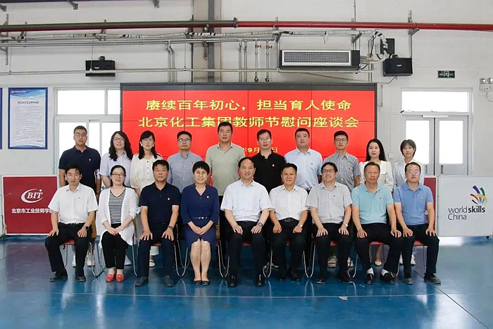 9月10日,在第37个教师节到来之际,北京化工集团党委书记、董事长王国华,党委副书记吴瑞峰专程来到技师学院,看望慰问教师和教育工作者,向老师们送去教师节的问候,并与教师代表亲切交流。技师学院领导班子成员和教职工代表参加座谈会。